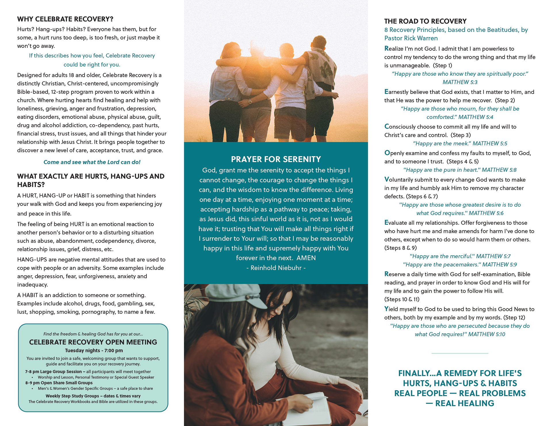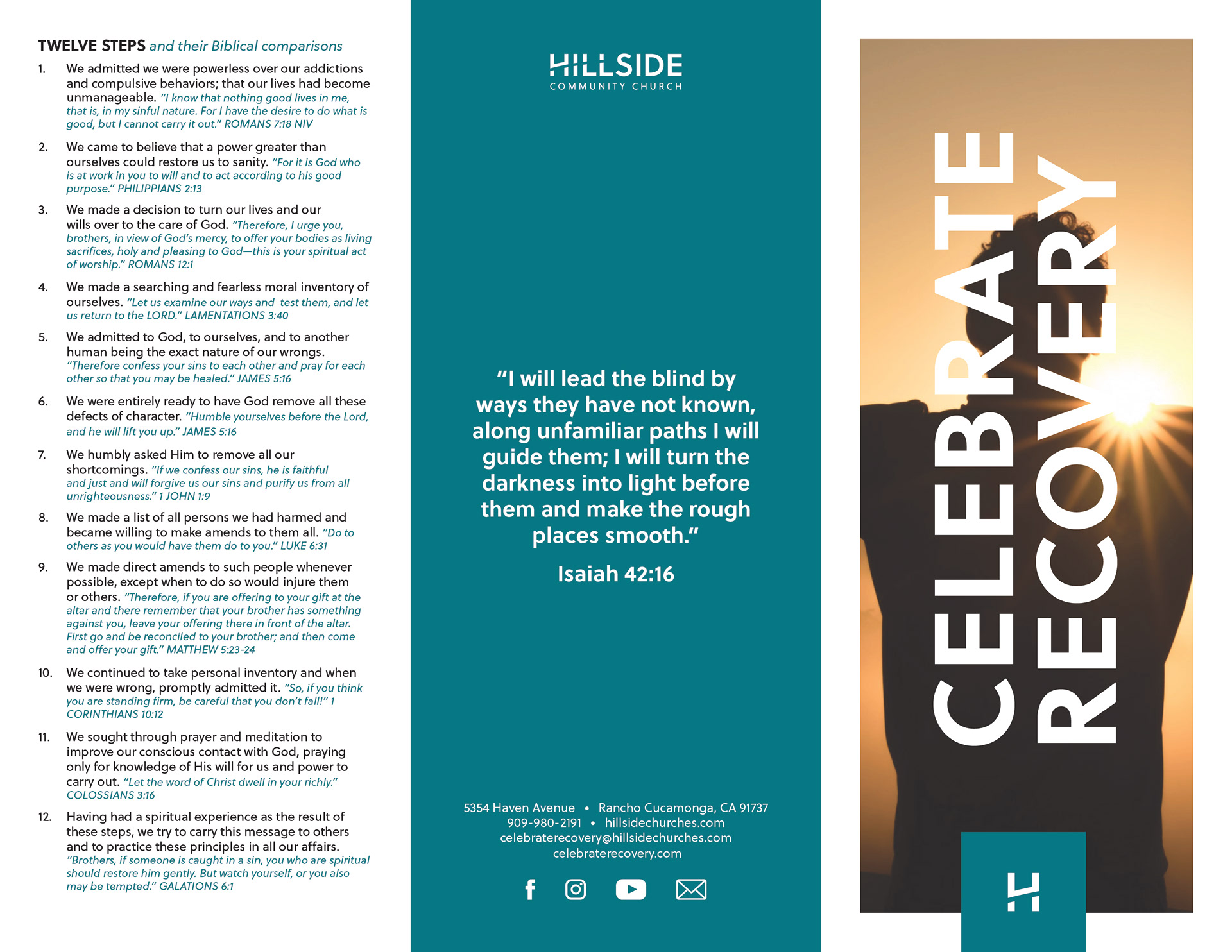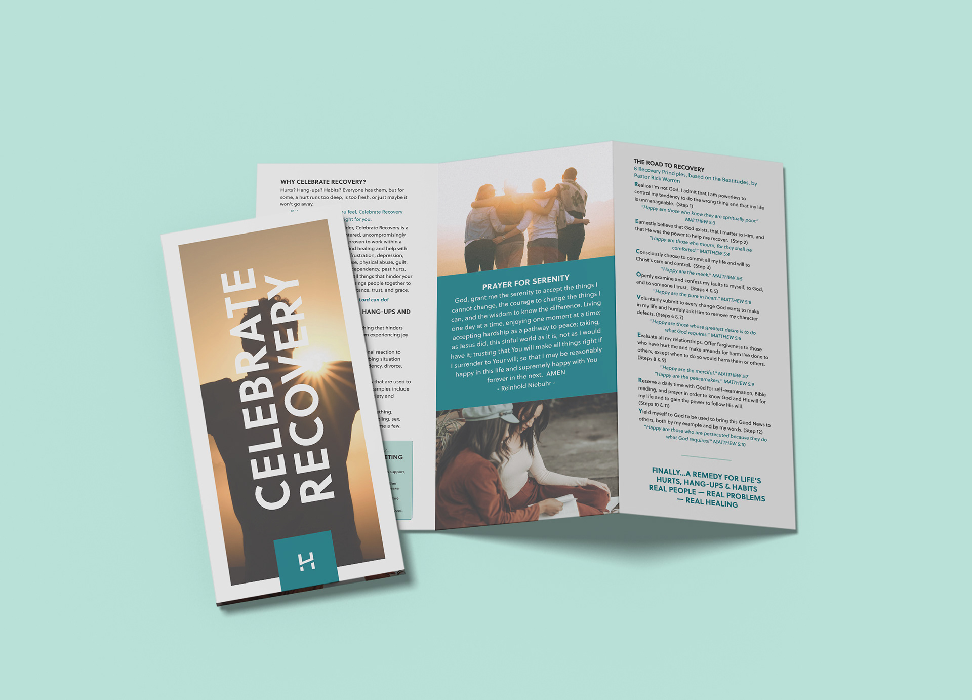 Celebrate Recovery is a faith-based 12-step program at Hillside Community Church to help you navigate hurts, habits, and hang-ups. I had the opportunity to design the layout and overall design of the trifold brochure.